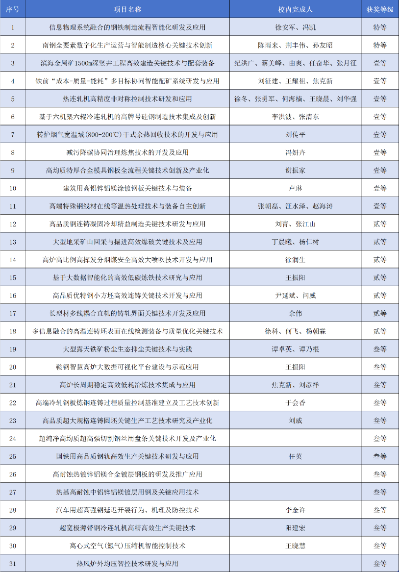 据悉,冶金科学技术奖由中国钢铁工业协会、中国金属学会创办,是中国冶金行业最高科学技术奖。本次共有110个项目获得表彰,其中特等奖3项、一等奖21项、二等奖29项、三等奖57项。