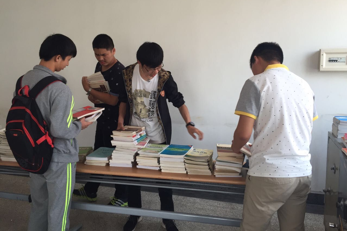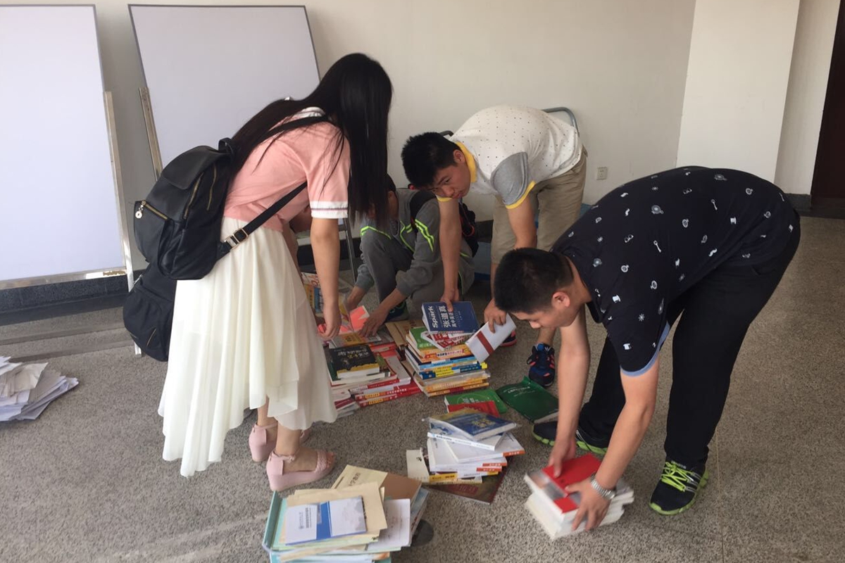 5月17日上午,求是协会的成员与志愿者们早早来到719整理书籍。收集的书籍范围广泛,更有课本与作业辅导资料,数目种类可观,大家将书籍分类整理以便分发给大一大二的学生们。