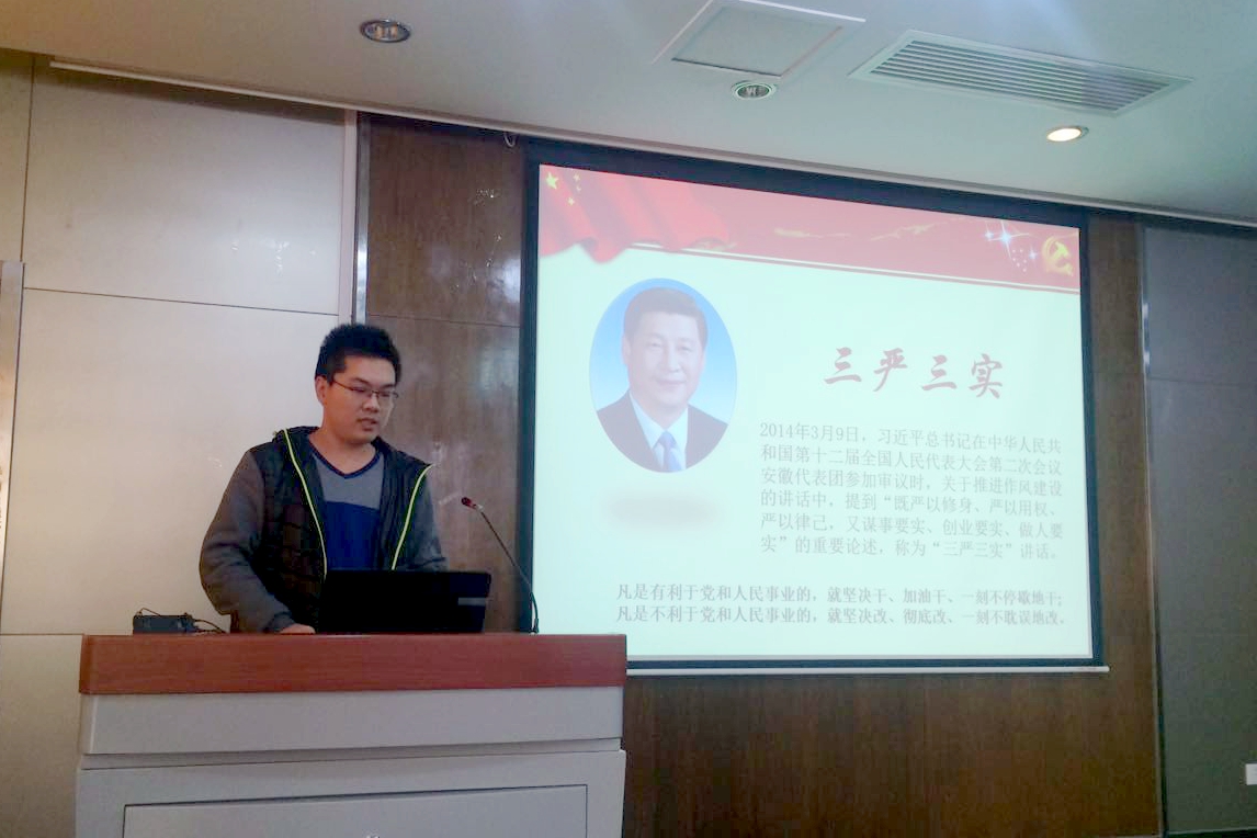 接着董志磊同志谈了他对“十三五”规划的认识和理解,为大家详细地阐述了“十三五”规划的内涵、制定的步骤、六大亮点以及其主要任务和最终全面建成小康社会的总目标。然后,蔡新雨同志对“三严三实”的每一项内容都做了认真地学习和认知,在会上也谈了自己的理解,并且倡导党员以及积极分子都要从身边的小事做起,践行“三严三实”,时刻反省自己的行为。最后进行展示的是白帆同志,他围绕“全面建成小康社会、全面深化改革、全面推进依法治国、全面从严治党”四个全面具体展开论述,分别表达了自己对四者的内涵及其逻辑关系、本质意义等的学习和认识。