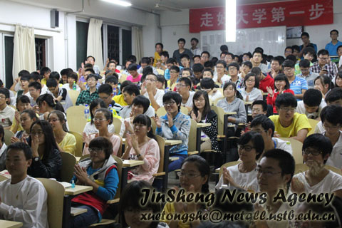 2012年9月21日晚7点,冶金生态楼110室迎来了一个欢乐的夜晚。由院团委学生会宣传部、求是学会以及本科12级年级组举办的题为“走好大学第一步”的迎新晚会在这里拉开了序幕。此次活动是我院本科12级新生首次参加的学院晚会,因此学院邀请了何淑兰老师、团委学生会副主席刘阳、于海洋作为嘉宾为到场的12级新生进行主题宣讲。