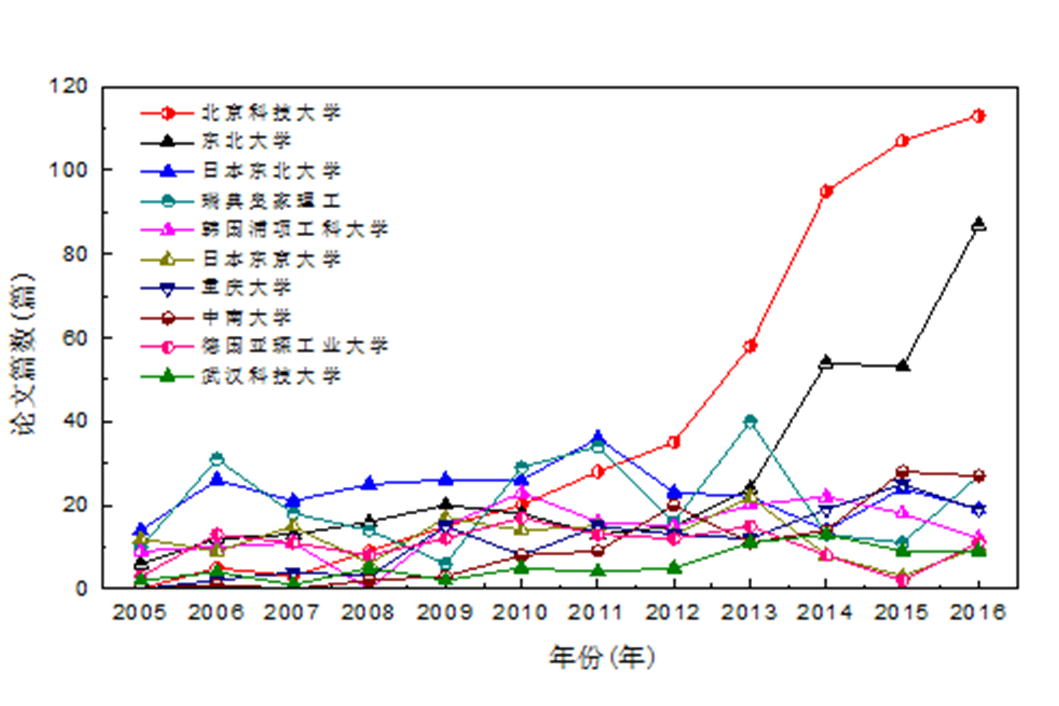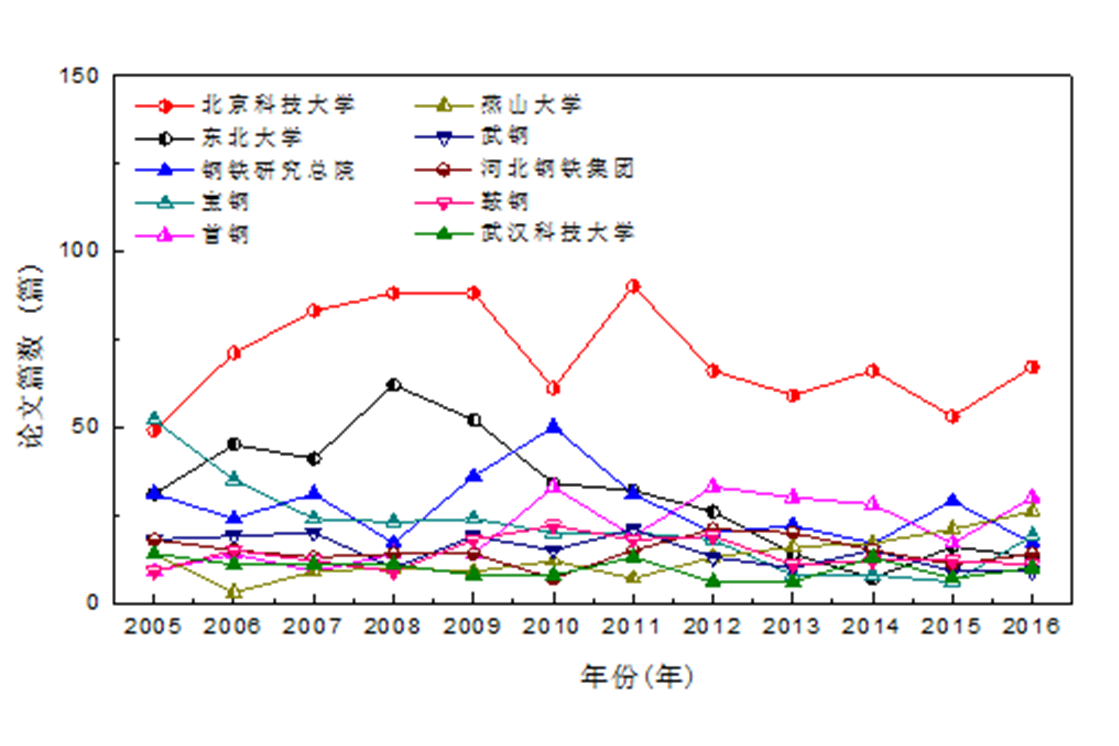 统计,2005―2016年,在钢铁冶金学科国内三大期刊《钢铁》、《炼铁》、《炼钢》上发表的文章,第一作者单位为age动漫