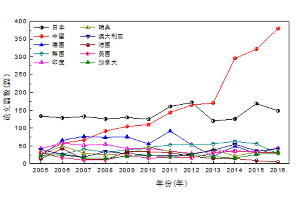 的文章一直居于国内首位,在2016年达到67篇(见下图)。
