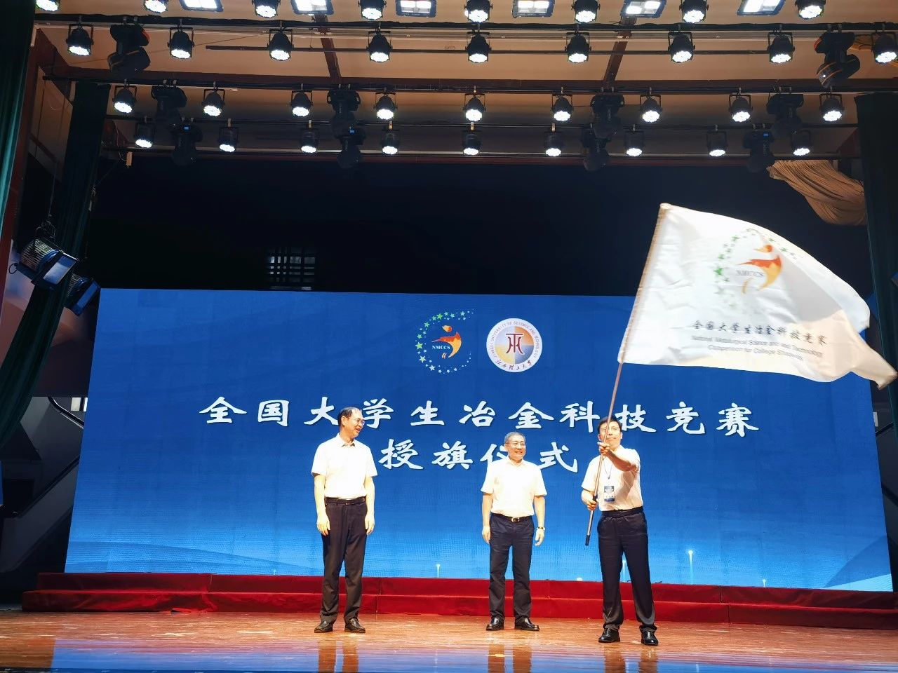 在会旗交接仪式上,江西理工大学副校长廖春发把大赛旗帜转交到中国金属学会秘书长王新江手中,再由王新江授予第八届大赛承办单位age动漫 ,宗燕兵郑重接过了大赛旗帜。