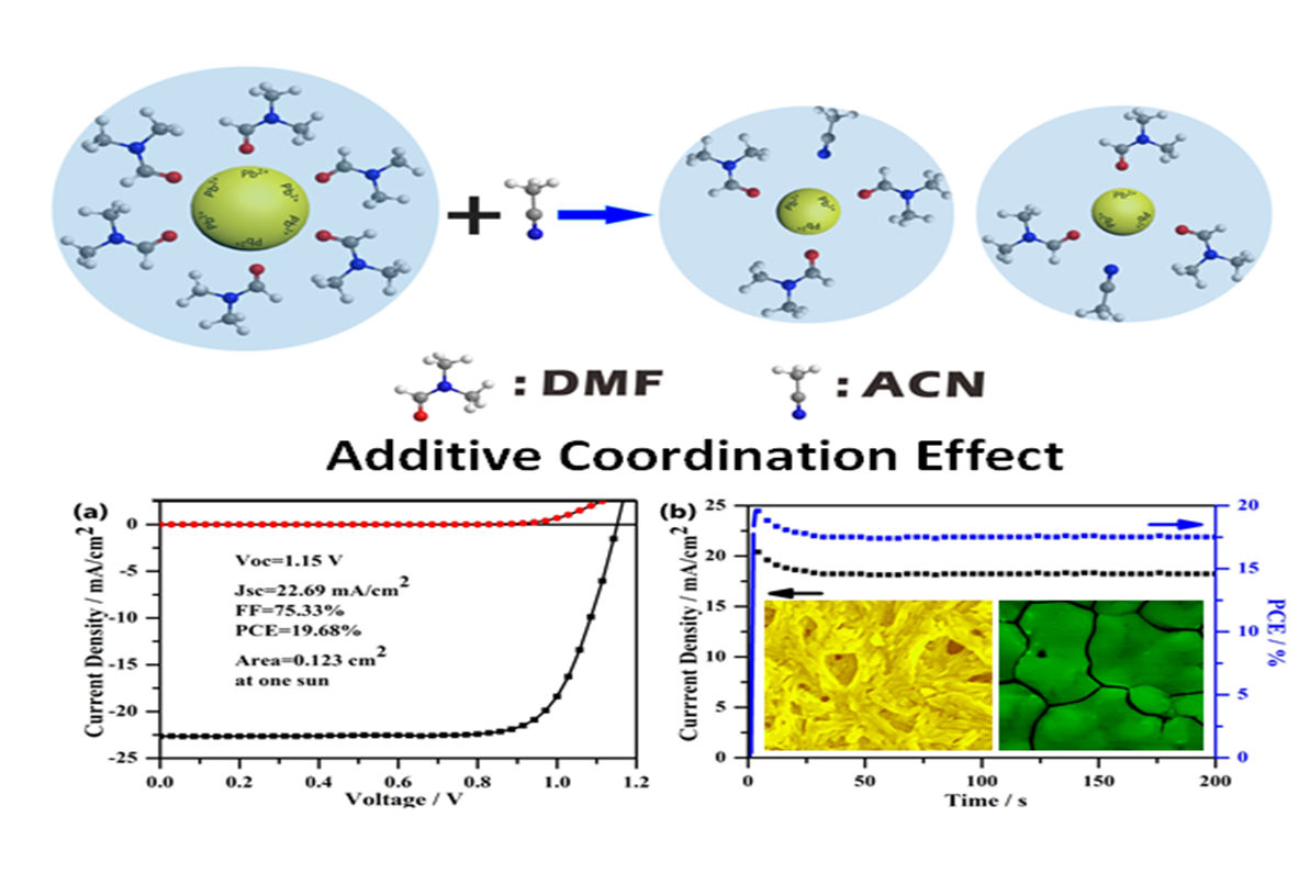 太阳能作为一种广泛被利用的新能源,由于具备可再生、绿色环保的优势成为了极具潜力的可替代清洁能源,其中,利用太阳能电池发电就是目前研究的热点之一。而能否制备高质量钙钛矿膜(致密、均一、晶粒尺寸微米级)直接影响到钙钛矿太阳能电池的转换效率。王新东课题组采用两步旋涂法制备400nm钙钛矿薄膜,深入研究了不同PbI2溶液添加剂对PbI2以及CH3NH3PbI3形貌的控制,并阐述了添加剂对钙钛矿材料形核生长的影响机理。利用乙腈作为添加剂组装的电池最高效率达到了19.7 %,达到国际先进水平(21.8%,Science, 2016, DOI: 10.1126/science.aah5557)。另外电池的稳定性较DMSO也有很大的提升。