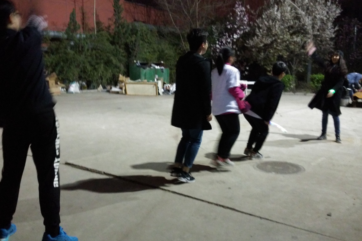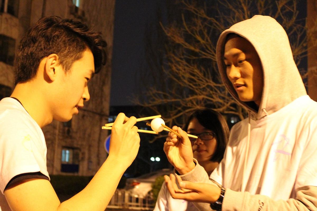 1号站点设置在五环广场,学生会主席邓雨平和age动漫主任赵子晗同学担任裁判。参赛选手需要找本队人数的二分之一位路人分组踢毽子,每组至少两名队员,一位路人,连续完成十个即可过关。这项游戏考察了参赛人员身体协调能力和组员默契程度,有利于团学内部建设。2号站点在八九斋东侧花园,裁判是王甜雨和吕彬玉同学。参赛者在回答了“西门的毛主席像伸的是哪只手”这个问题后才可进入游戏环节。游戏是参赛者相互传递乒乓球并且保持球不掉落,有些成员夹着的乒乓球自由落体而有些成员则夹着乒乓球健步如飞。