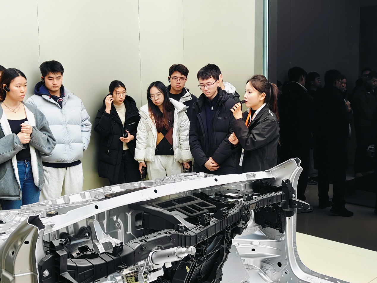 随后,师生们乘坐摆渡车驶入现代化厂区,依次探访压铸车间、冲压车间、车身车间。走进车间,明亮整洁的生产环境与高度自动化的生产线令人震撼:数百台工业机器人协同作业,机械臂精准完成焊接、装配等工序,智能运输小车按预设路线有序穿梭,让大家对“工业4.0”的高效与精准有了最直观的认知。