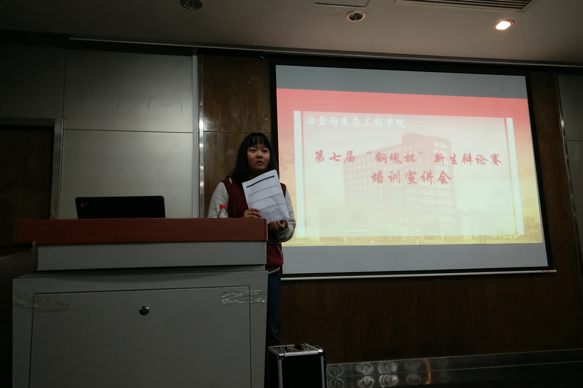 10月16日晚,age动漫 第七届“钢魂杯”新生辩论赛培训宣讲会在冶金楼青钢报告厅顺利召开。本次培训宣讲会由冶金1502班王甜雨同学主持,校立言辩论队队长樊婧同学、副队长张静远同学、程婉婷同学对参赛者进行了关于辩论赛的准备工作、辩论技巧和答辩礼仪等方面的培训。